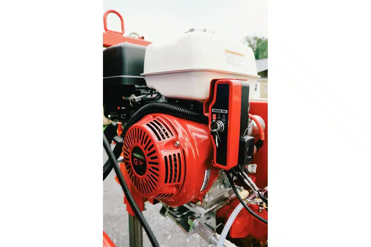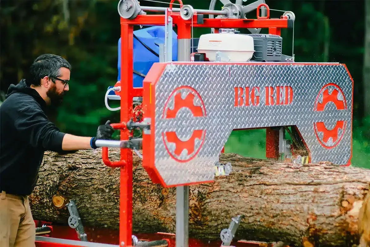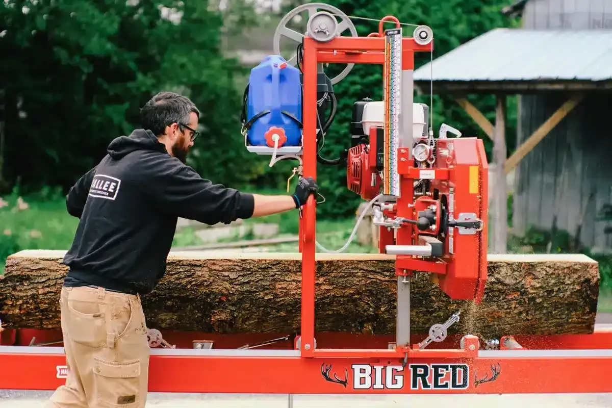 The Big Red comes standard with a 24-foot-long frame and features 4 levelers along with 4 log clamps. This setup allows you to saw two logs simultaneously or saw at the front while edging boards at the back in a single pass. The Big Red features electric cutting height adjustment and a heavy-duty 2” x 6” x ³⁄₁₆” tubular steel welded frame, making it extremely sturdy and guaranteeing precise cuts. The Big Red is also equipped with a powerful Honda engine, providing reliable performance day after day.